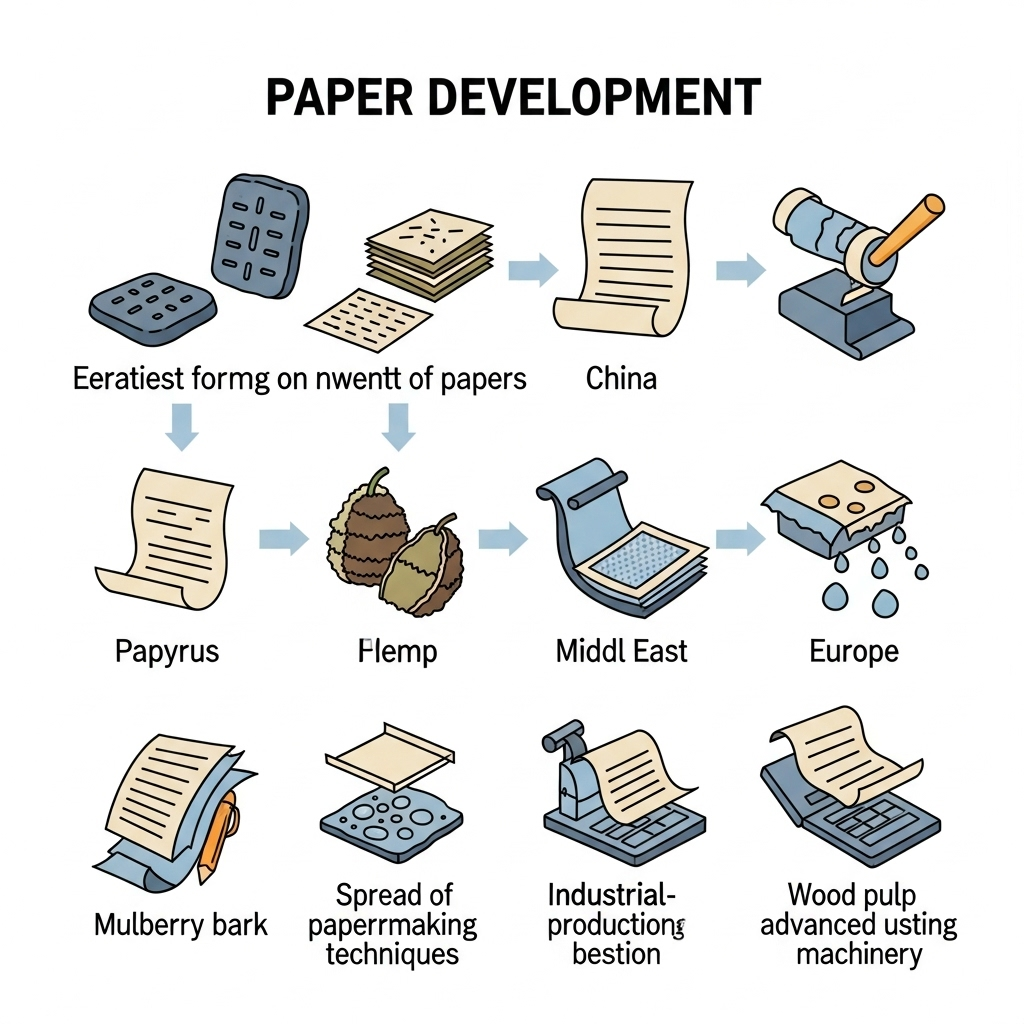 Kağıt, ilk olarak MÖ 2. yüzyılda Çin’de icat edildi. Han Hanedanlığı döneminde Cai Lun, ağaç kabukları, kenevir ve bez parçalarını kullanarak kağıt yapımını geliştirdi. Bu “İnsanlık Tarihinde ‘Kağıt”ın Gelişimi”